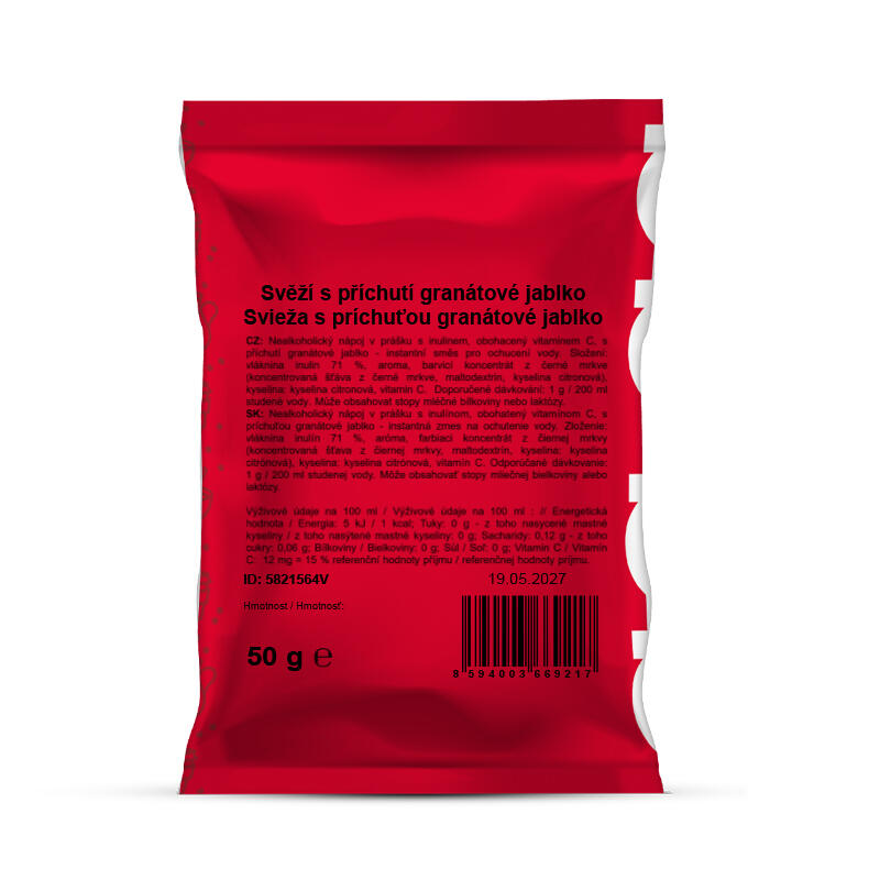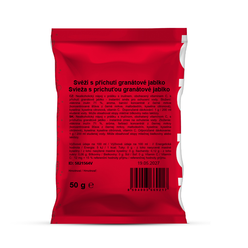 Instantní nápoj v prášku Svěží s příchutí granátové jablko s inulinem je lehký a osvěžující způsob, jak dochutit vodu a zároveň podpořit pitný režim. Neobsahuje žádný přidaný cukr ani sladidla, přesto potěší přirozenou chutí. Díky obsahu inulinu a vitamínu C je vhodný pro děti i dospělé a skvěle se hodí k pravidelnému doplňování tekutin doma, ve škole, v práci i během teplých letních dnů. Praktická příprava z něj dělá ideální volbu pro každého, kdo hledá svěží chuť a jednoduché složení v jednom.